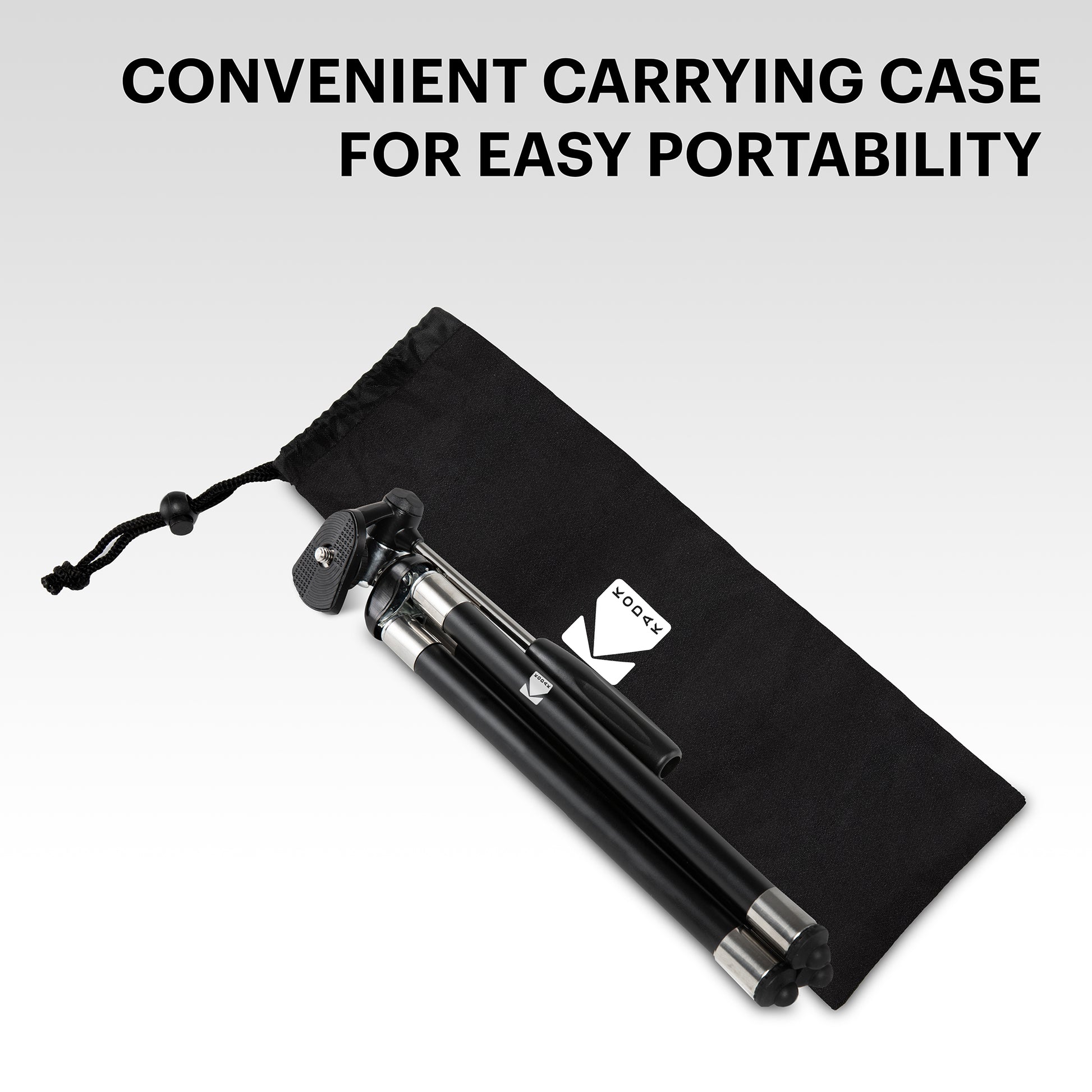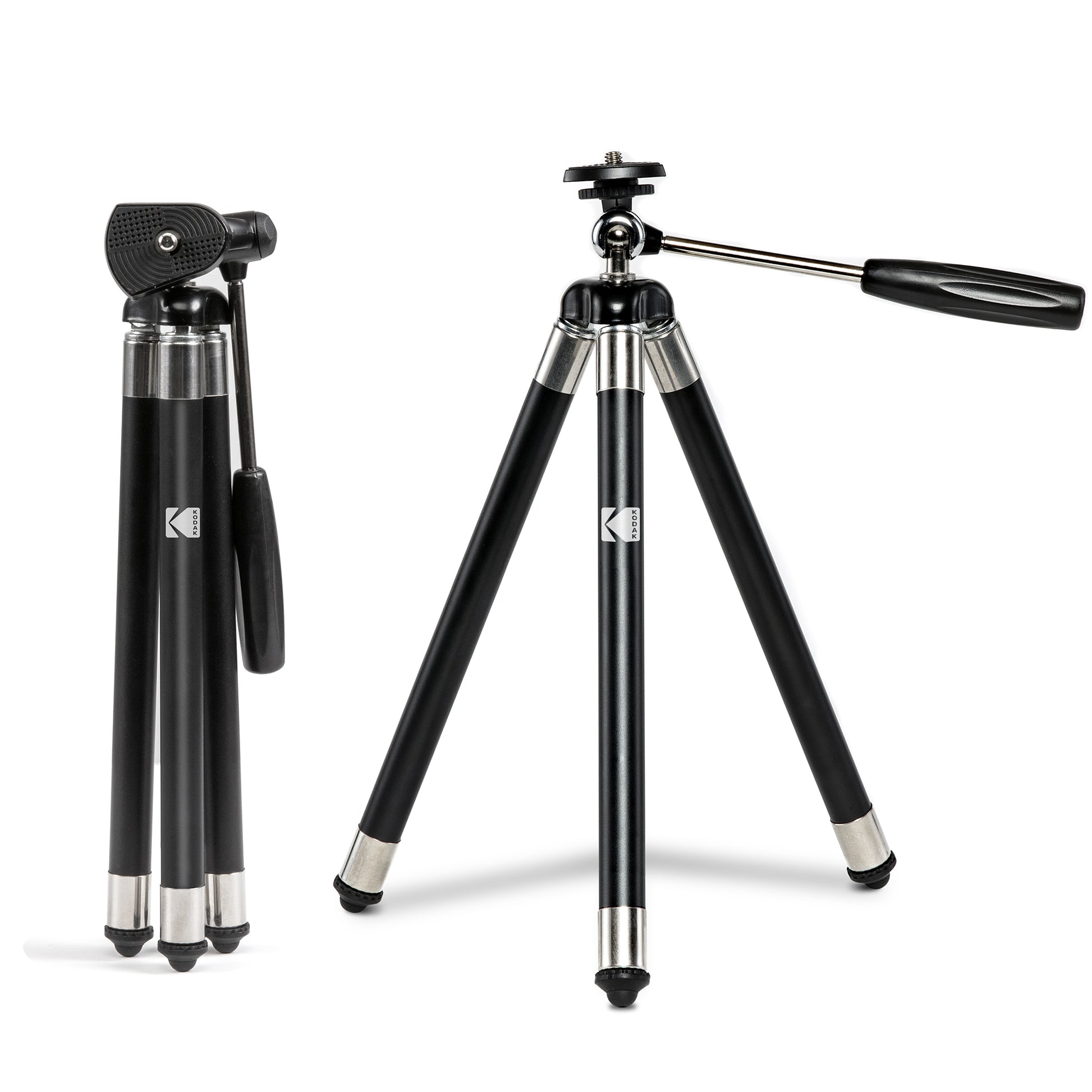 Get amazing shots with the KODAK Photo Gear Tripod with Remote 42”/106.6 cm. Set your camera up on this quality tripod or equip the included smartphone adapter to use your cellular device. Do not worry about an angle being unbalanced because with the rubber feet, you can make sure everything is flat and stable. Snap several unique shots from different heights using the adjustable leglock system. No need to even stand behind the tripod when you use the Bluetooth® remote. Stand from a distance and take several pictures with the press of a button.